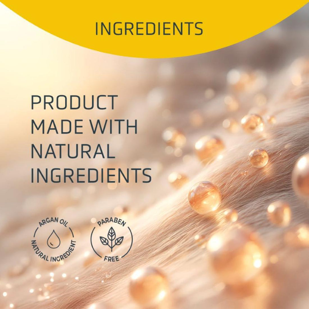 Moisturizing shampoo with argan oil, ideal for dogs with long, dry, or damaged coats. Adds shine, softness, and nourishment without drying out the skin.