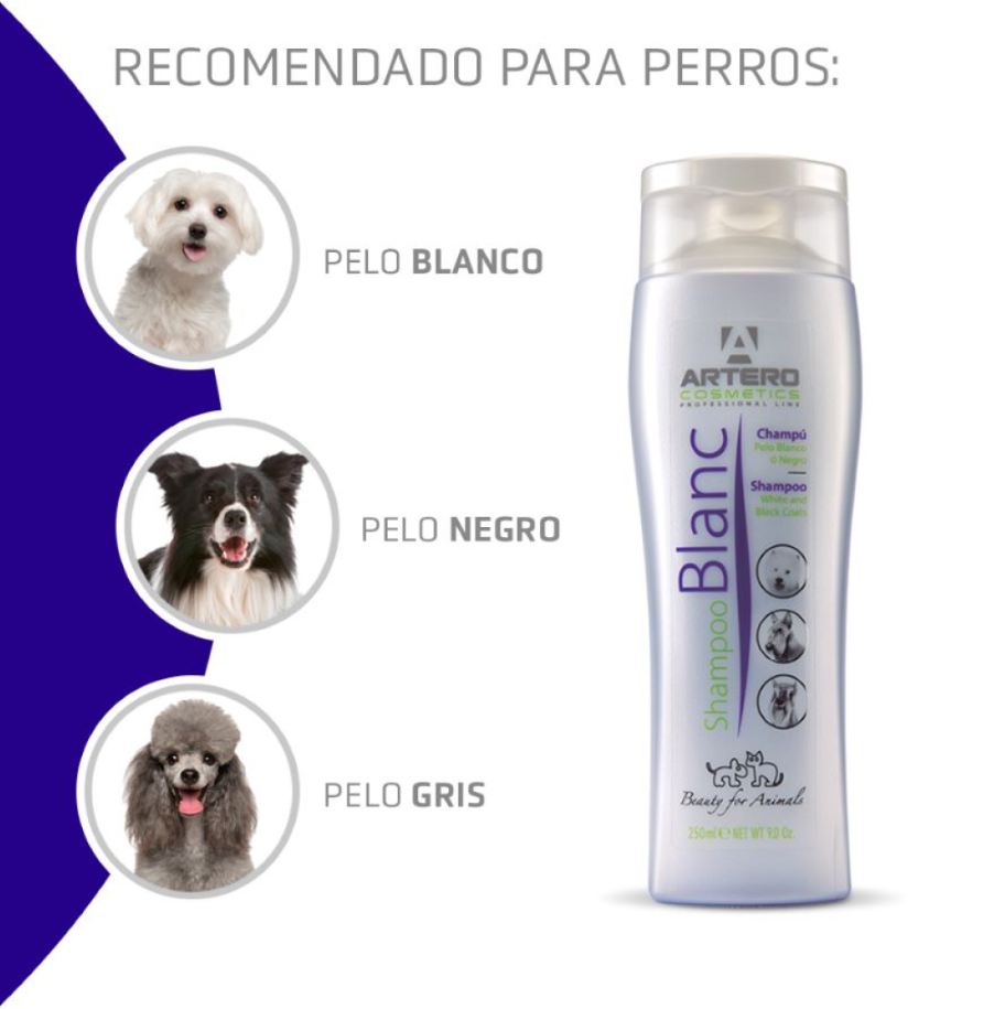 El Champú Artero Blanc está destinado, principalmente, a perros de pelaje blanco, gris y/o negro. Sus pelos tienden a perder brillo y tornarse opacos por agentes externos propios de su vida animal.
