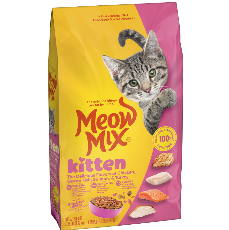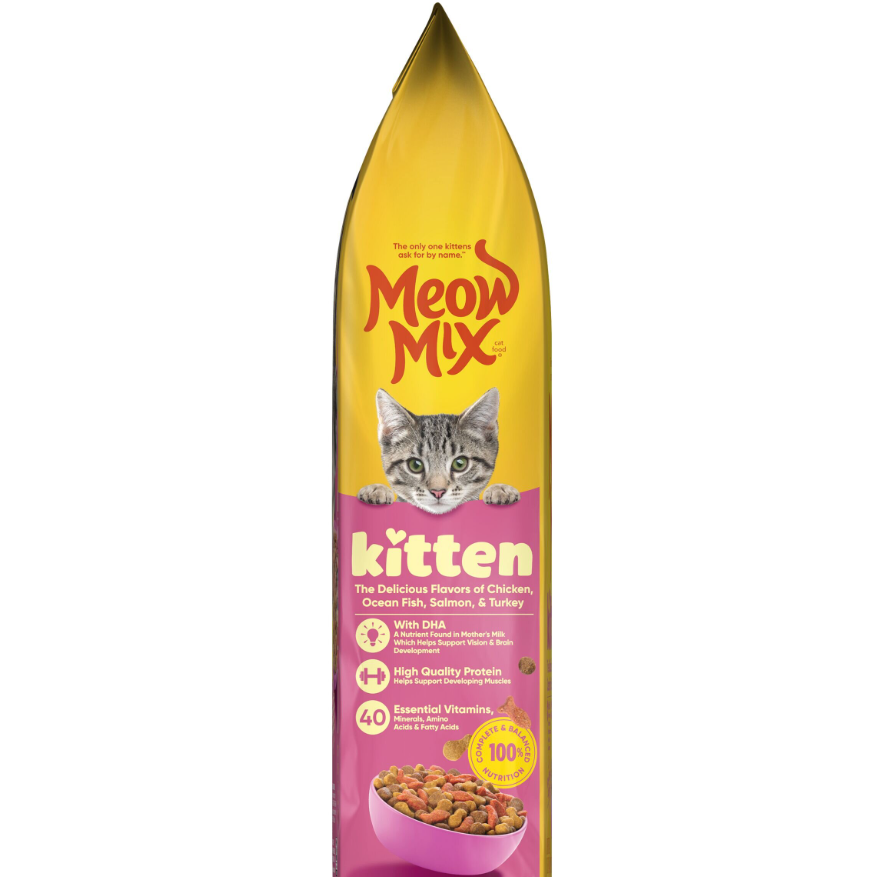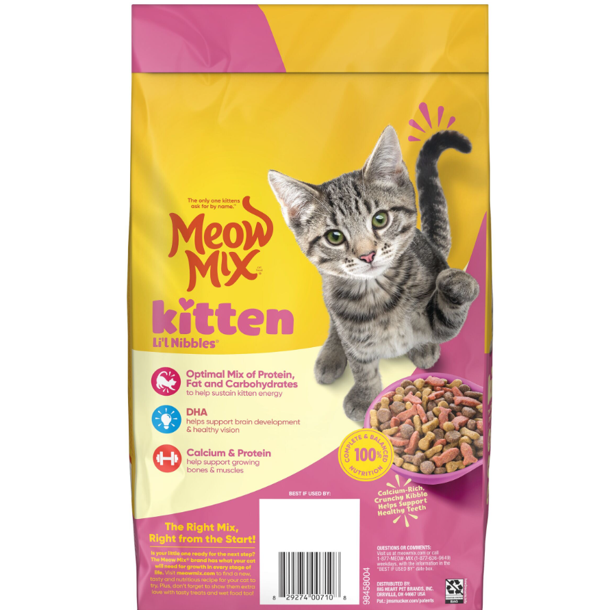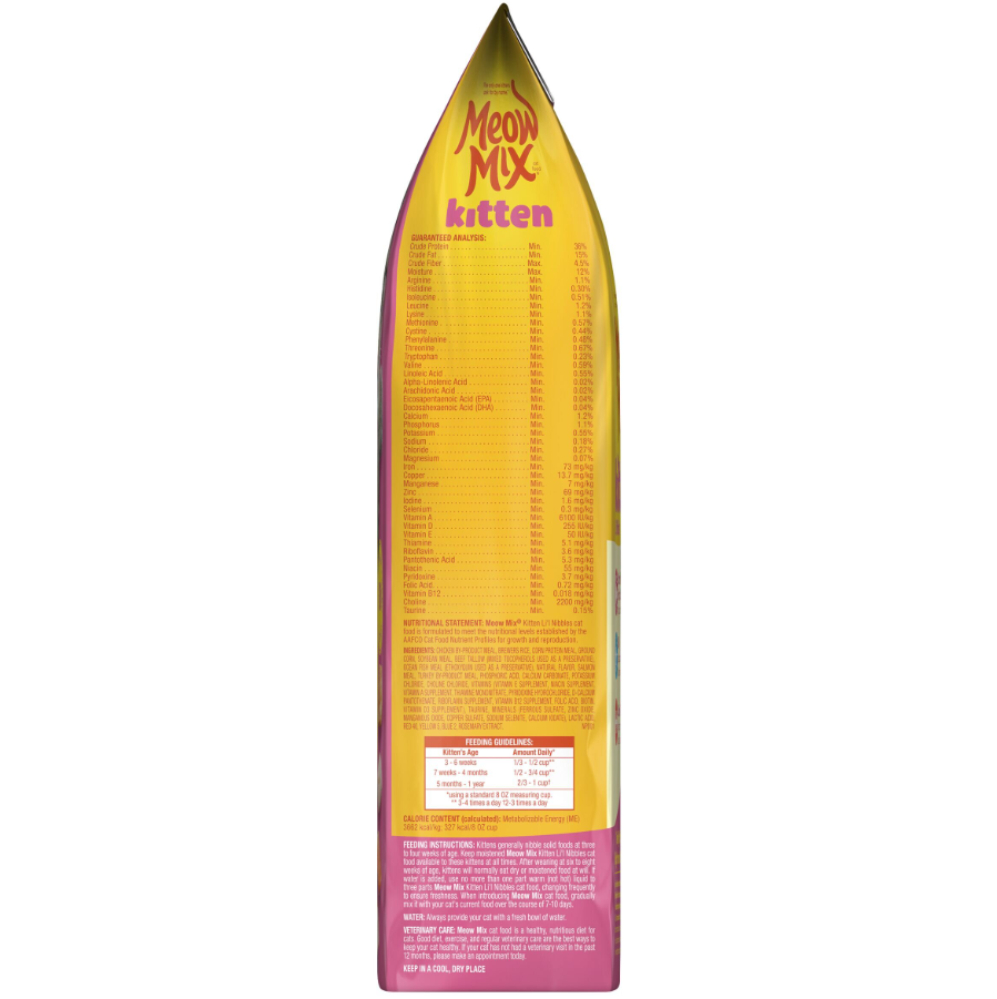 The tasty smaller kibbles in our Meow Mix® Kitten Li'l Nibbles® dry cat food contain all essential nutrients needed to help kittens grow up healthy and happy. High-quality protein and essential fatty acids help support muscle growth and healthy brain development. Irresistible flavors make this more than just a meal...it's Meow Mix Mealtime!
