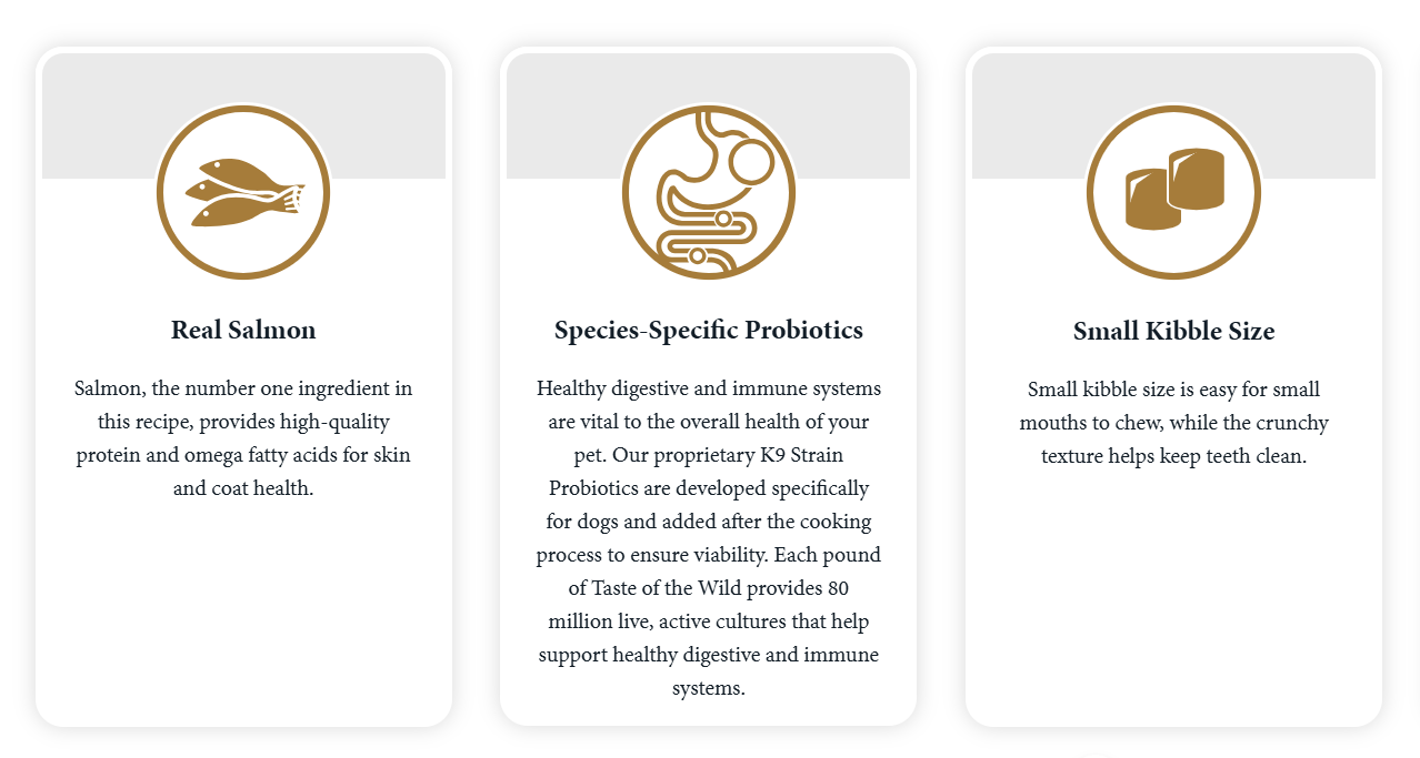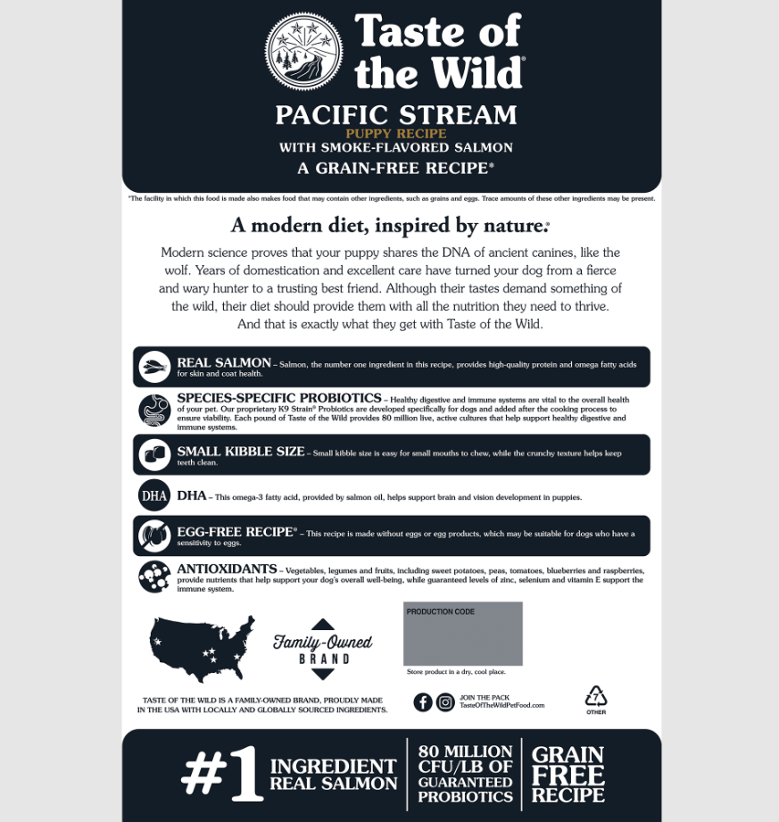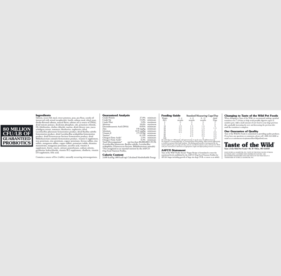 Taste of the Wild Pacific Stream Puppy Recipe is formulated to meet the nutritional levels established by the AAFCO Dog Food Nutrient Profiles for All Life Stages including growth of large size dogs (70 lb. or more as an adult).