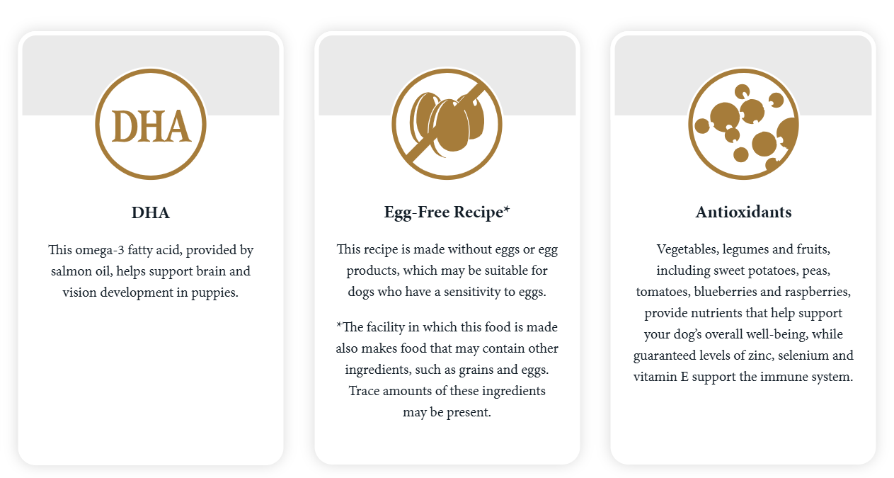 This egg-free recipe* gets all its animal protein from fish, meaning that it’s rich in the omega fatty acids that help keep skin healthy and fur smooth and shiny. Unique flavors from smoke-flavored salmon, vegetables, legumes and fruits in a small kibble size make it easy for puppies to enjoy the nutrients they need for overall vitality. Because of the balanced nutrition and guaranteed levels of DHA, this recipe is good for pregnant or nursing mothers and other adult dogs as well.