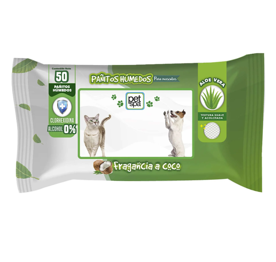 Limpia a tu mascota con suavidad y sin complicaciones gracias a los pañitos húmedos Pet Spa con fragancia a coco. Su fórmula con aloe vera y clorhexidina cuida la piel y elimina malos olores, sin alcohol ni ingredientes agresivos. Ideales para el uso diario, con una textura acolchada que arrastra la suciedad de patas, pelaje o zona íntima sin irritar. Perfectos para refrescar a tu peludo en casa o mientras pasea.
