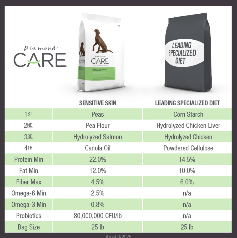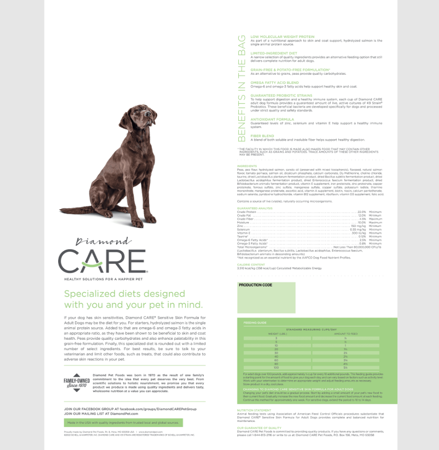 Animal feeding tests using Association of American Feed Control Officials procedures substantiate that Diamond CARE Sensitive Skin Formula for Adult Dogs provides complete and balanced nutrition for maintenance.