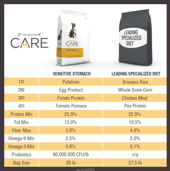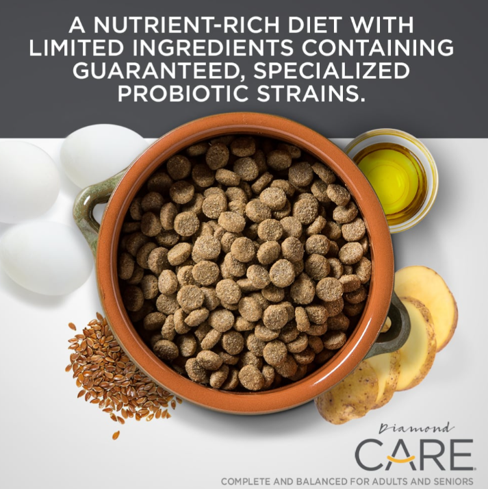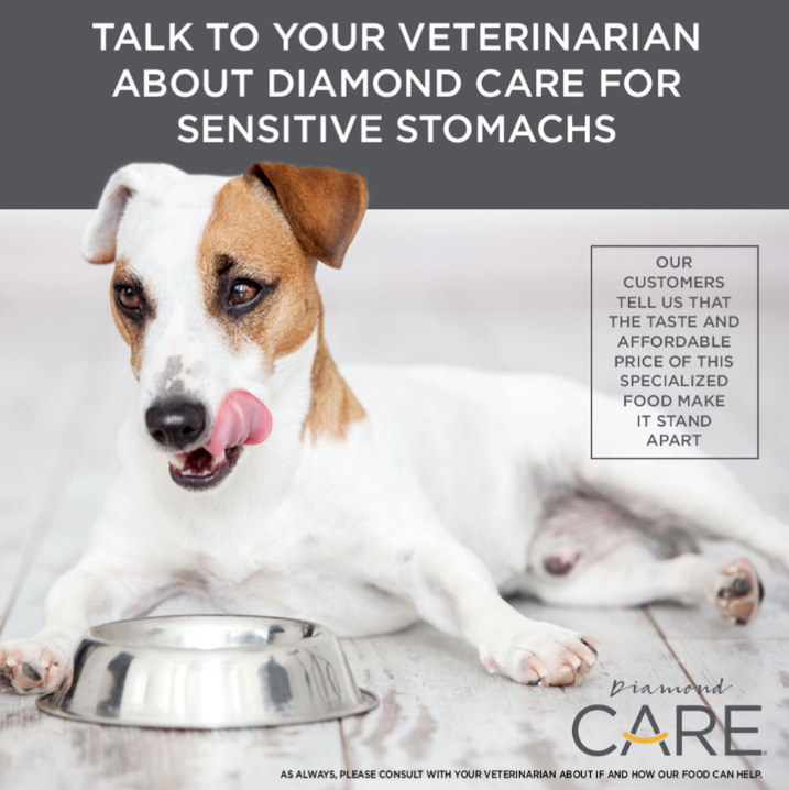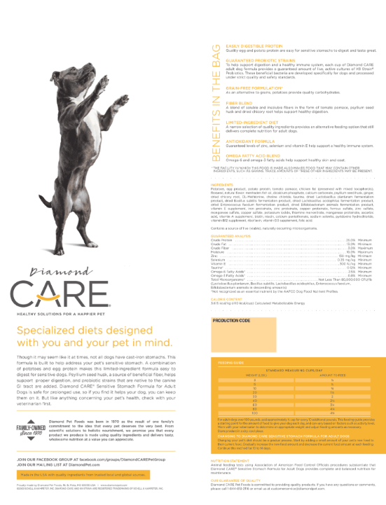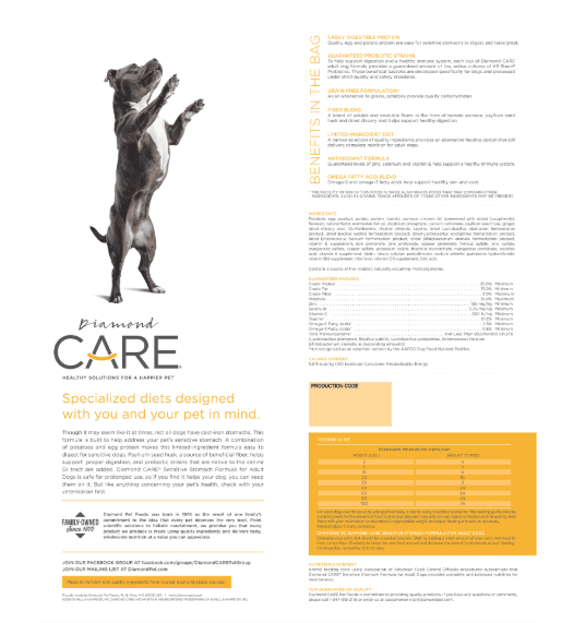 Animal feeding tests using Association of American Feed Control Officials procedures substantiate that Diamond CARE Sensitive Stomach Formula for Adult Dogs provides complete and balanced nutrition for maintenance.