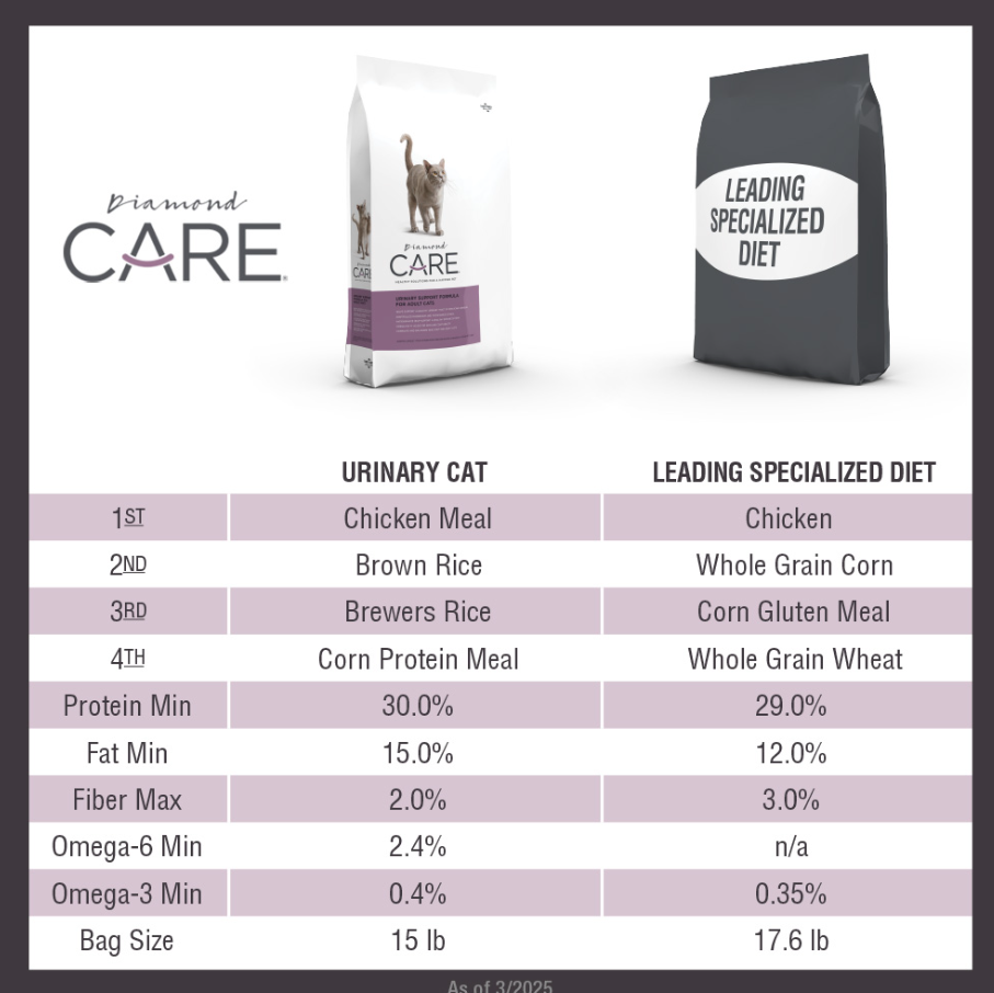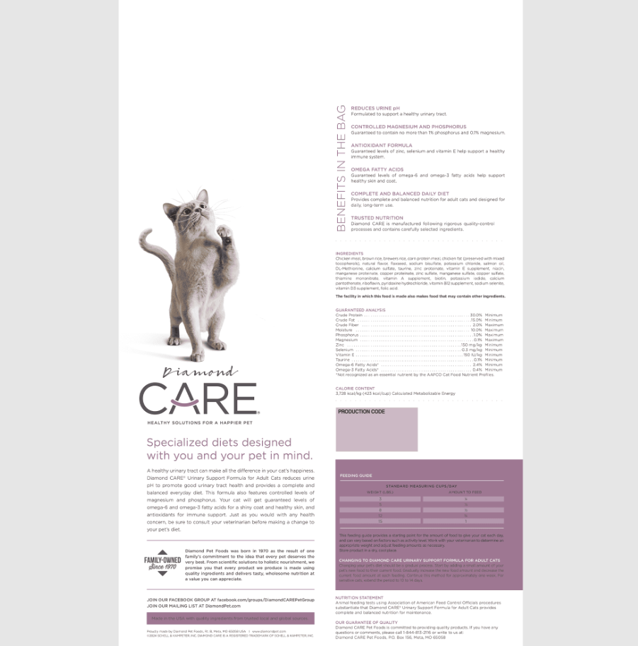 Animal feeding tests using Association of American Feed Control Officials procedures substantiate that Diamond CARE Urinary Support Formula for Adult Cats provides complete and balanced nutrition for maintenance.